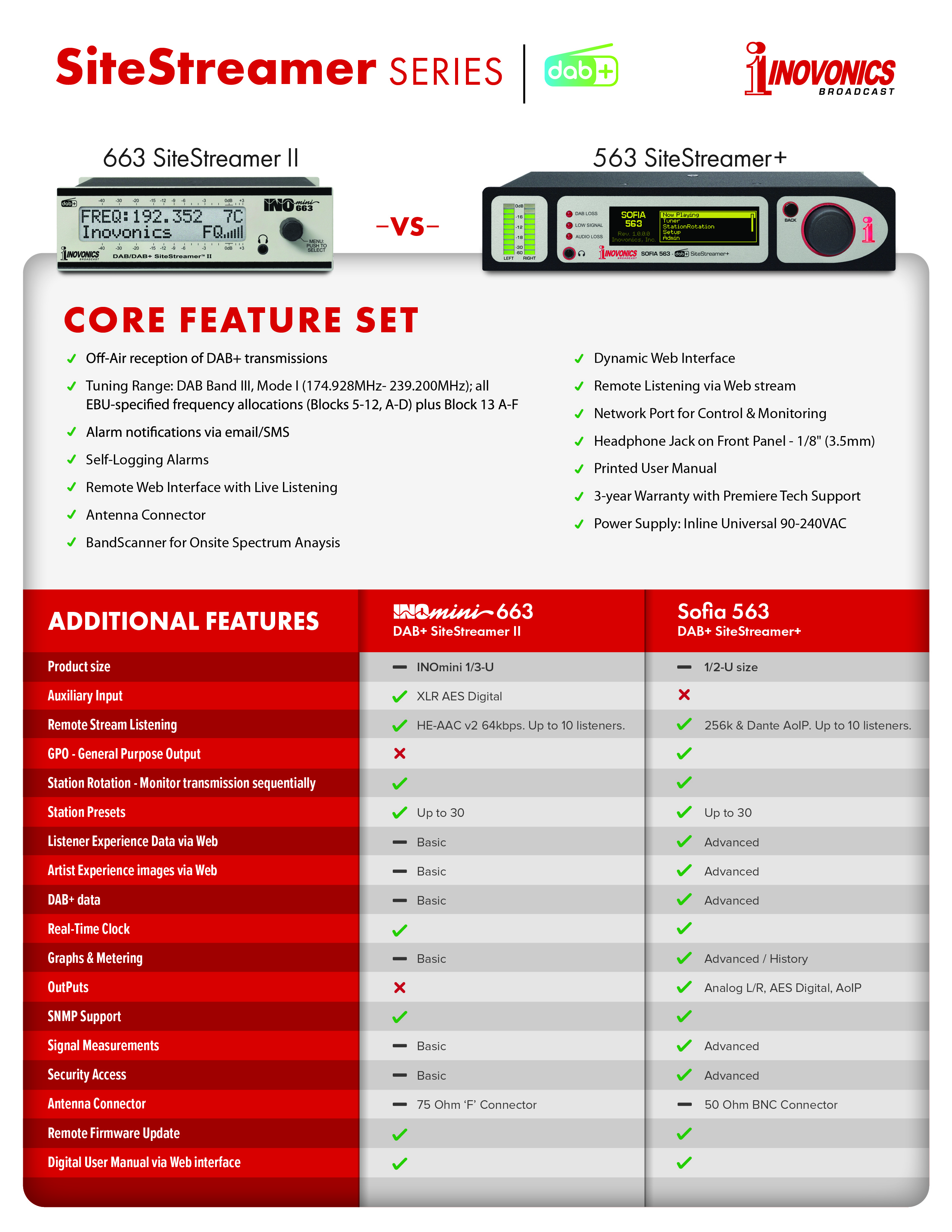 SOFIA 563 DAB+ SiteStreamer+™ is the latest model in the SOFIA SiteStreamer+ family of elite SiteStreamers with advanced features for critical monitoring situations. Additional SOFIA models are available for AM, FM, and HD Radio.