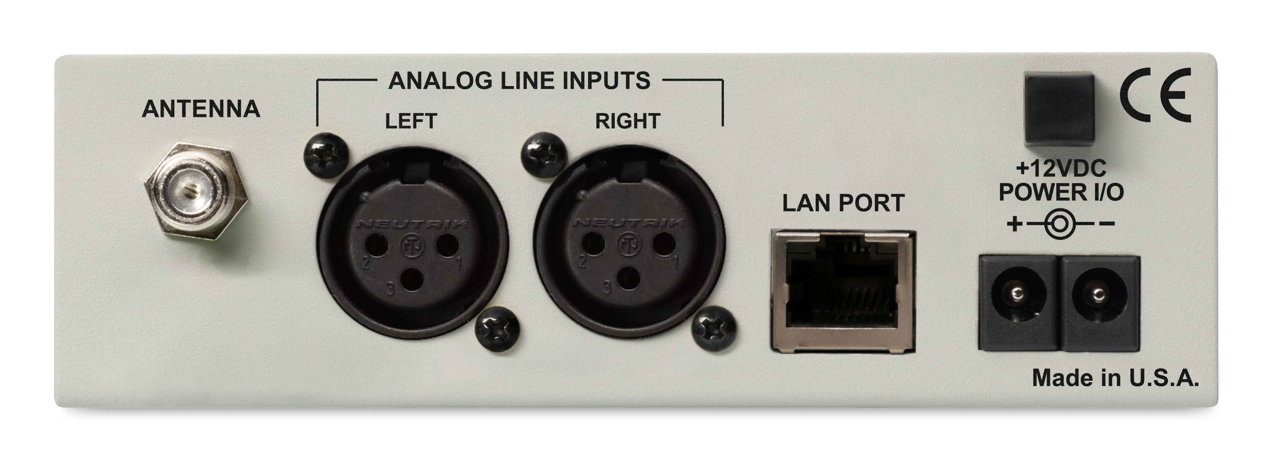 Active-balanced (XLR) stereo left/right or dual-monaural analog AUX inputs with menu-selectable +4dBu or –10dBu nominal reference levels. Local and remote switching between off-air and AUX line-in feeds.