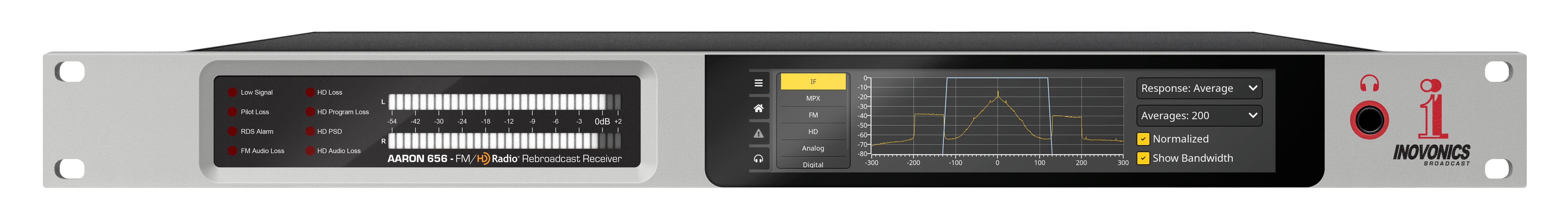 The AARON 656 features an advanced SDR-based FM/HD Radio™ receiver that utilizes Maximum-Ratio Combining (MRC) technology. The AARON 656's MRC Dual Tuner constantly monitors the SNR of Antenna 1, Antenna 2, and Both-Antennas-Combined, and automatically selects the cleanest signal. In addition to FM and HD1-8 program sources for rebroadcast, the 656 accepts analog, AES-digital, streaming program inputs and 4GB of memory for audio playback with fallback-priority selection. Outputs are FM-stereo-multiplex (MPX) as well as both analog and AES digital program line outputs and output streaming. Automatically returns to the programmed frequency and reception mode following a power interruption for hands-off remote reliability. 7-inch Touchscreen and Front Panel Meters and Alarm LEDs.