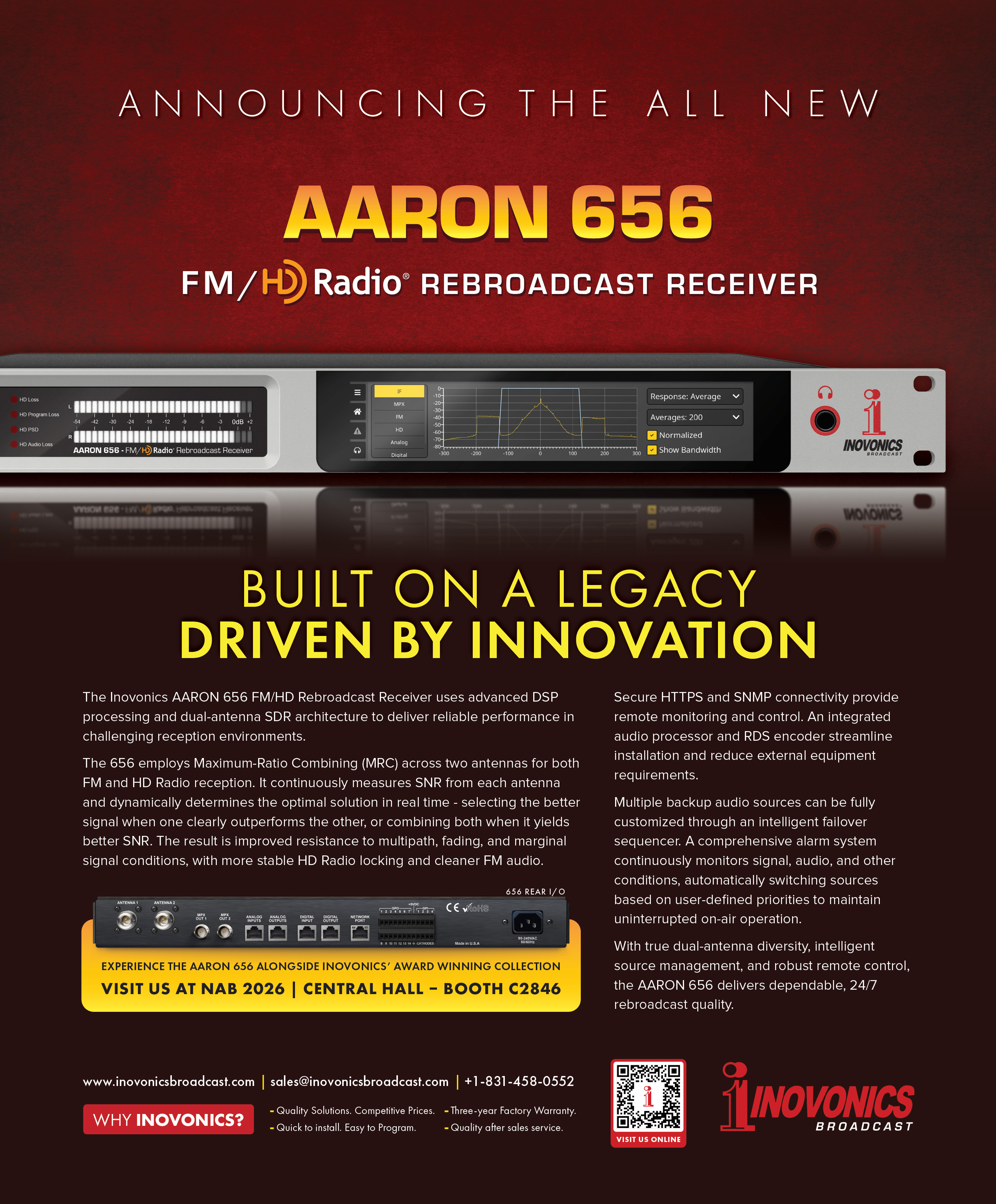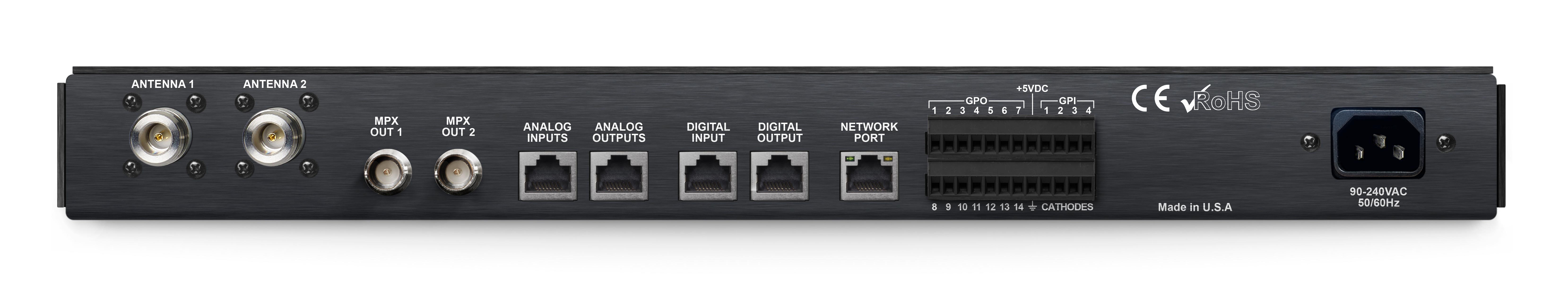 In addition to FM and HD1-8 program sources for rebroadcast, the 656 accepts analog, AES-digital, streaming program inputs and 4GB of memory for audio playback with fallback-priority selection. Outputs are FM-stereo-multiplex (MPX) as well as both analog and AES digital program line outputs and output streaming.